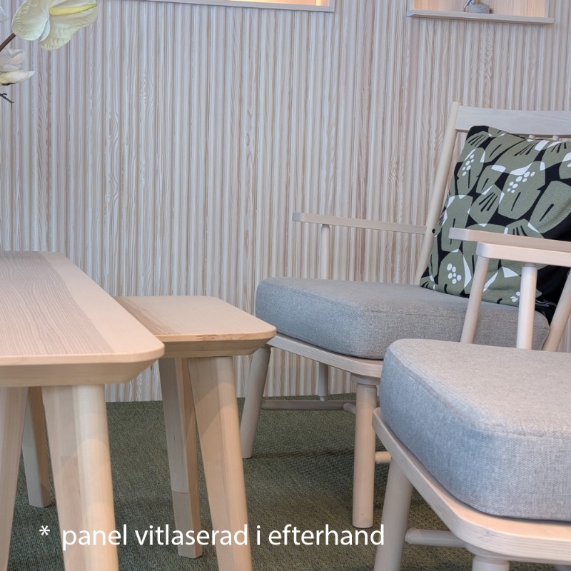 Vi har valt att använda oss av råvara i furu av högsta kvalité där det är minimalt med kvist. Vi producerar den 1-stav för att mellanrummet ska fördelas lika när panelen acklimatiserar sig med omgivningens klimat.